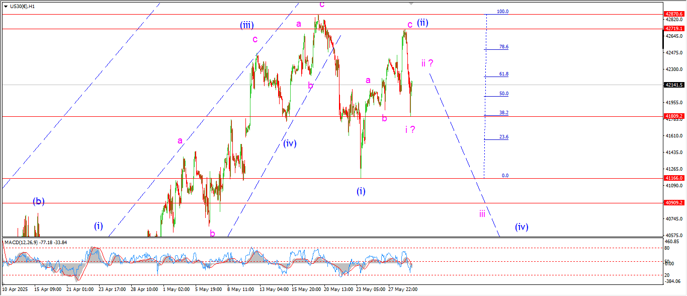 Watch for wave (ii) to hold and wave ‘iii’ of (iii) to begin with a drop below 41166 at the wave (i) low.