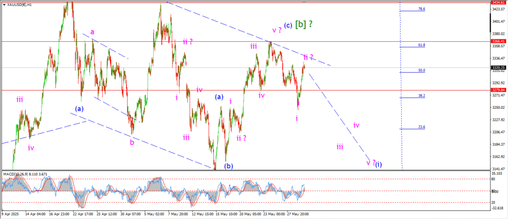 Gold broke below the wave ‘iv’ lows at 3279 again today which signals that wave ‘i’ is complete.