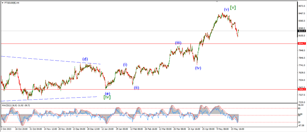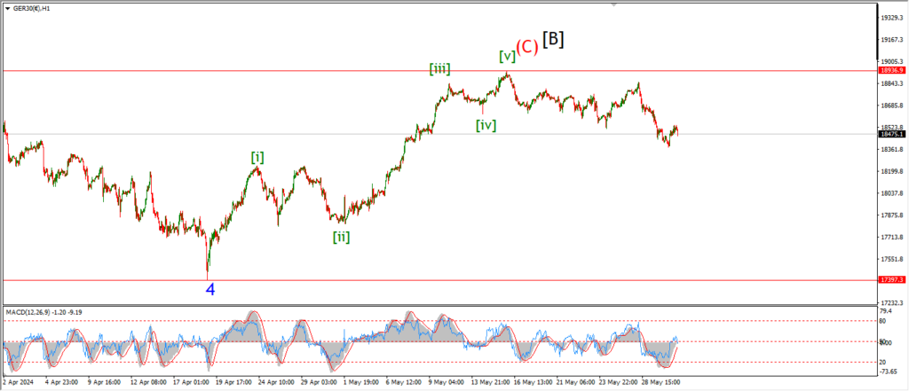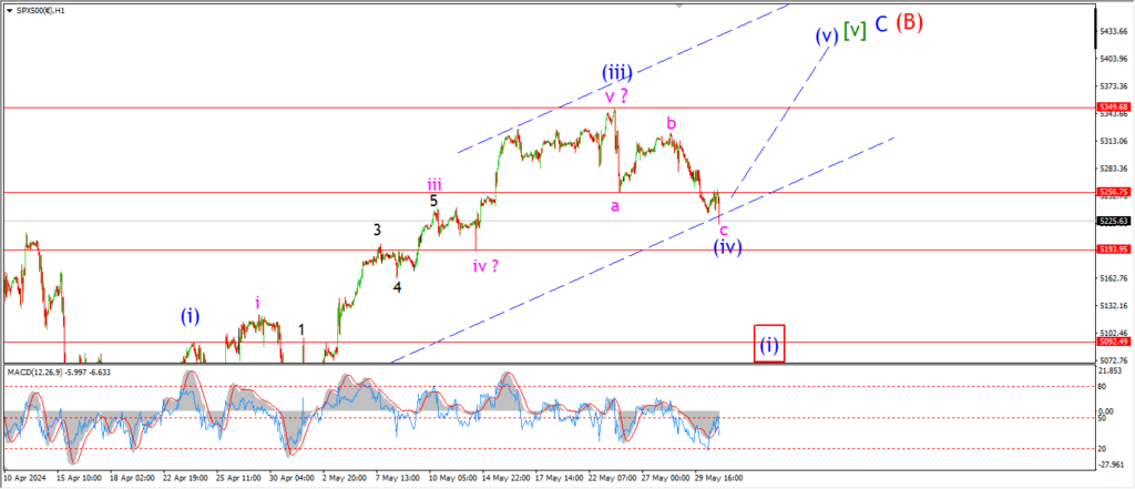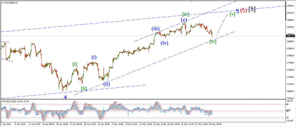 Watch for wave ‘c’ of (iv) to complete early tomorrow and then wave (v) should turn higher from there.