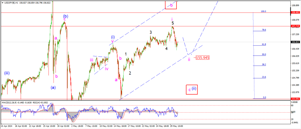 Watch for wave ‘ii’ to trace out three waves down and complete near 156.00 again.