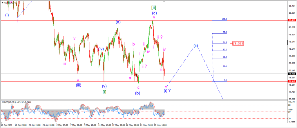 A sharp move lower this afternoon has now completed five waves down off the top at 80.46.
