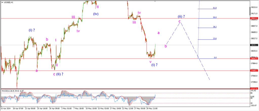 Watch for wave (ii) to trace out a three wave correction towards 39000 again.