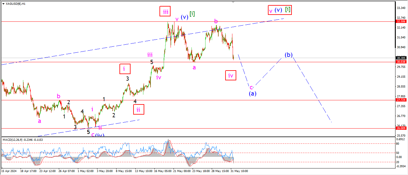 Watch for wave ‘c’ to complete five waves down near 29.00 again and from there we can look for wave (b) to begin.