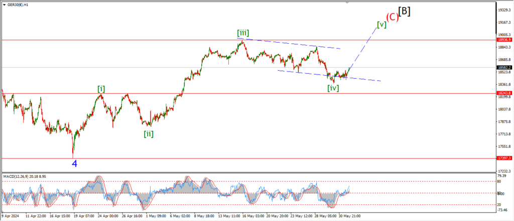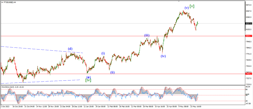 Watch for wave ‘c’ of (ii) to carry on higher to break the wave ‘a’ top and complete a three wave correction near the 50% retracement level.