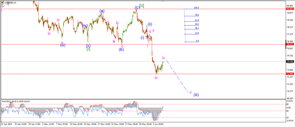 Watch for wave ‘iv’ to top out and then the price should drop back below 72.50 again to signal wave ‘v’ is underway.