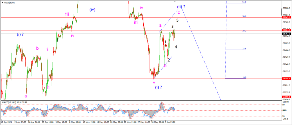 The Dow peeked back above the wave ‘a’ high at 38820 this evening in wave ‘c’ of (ii).