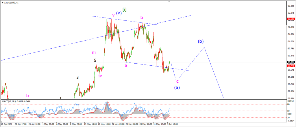 Silver has traced out three waves down in wave (a) at this weeks lows.