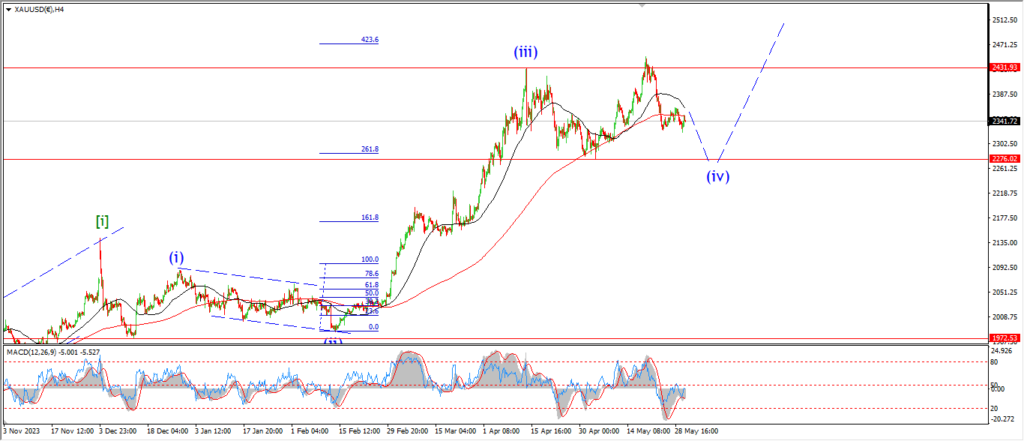 Crude is holding in a corrective sideways move today and I have labelled this wave ‘iv’ of (iii).
