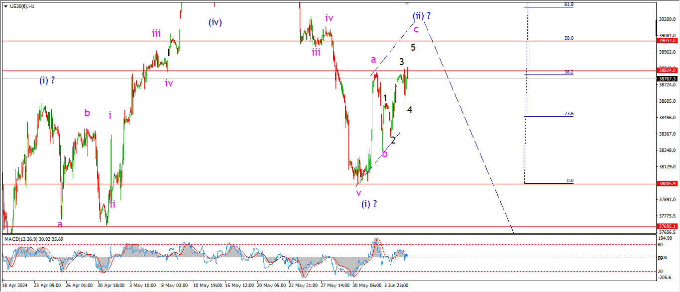 The Dow peeked back above the wave ‘a’ high at 38820 this evening in wave ‘c’ of (ii).