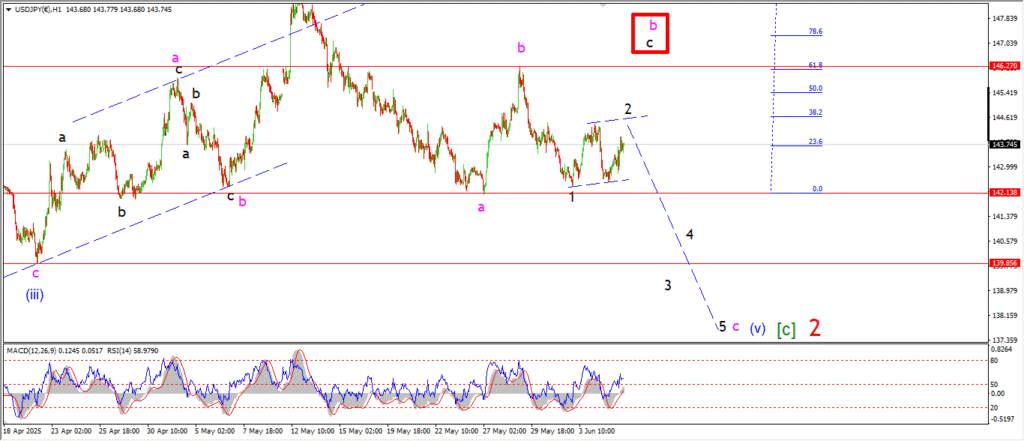 Watch for wave ‘3’ of ‘c’ to turn lower and break 142.13 to confirm the pattern.