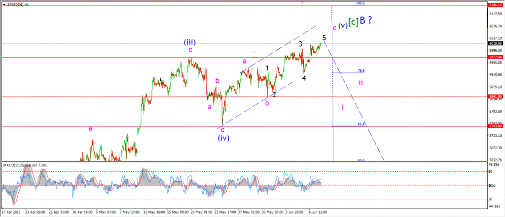 The S&P is holding at the highs of wave ‘c’ this evening with a very soft trade today.