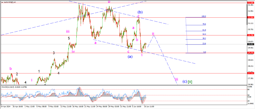 A small move higher in silver today is in line with the correction in wave ‘ii’ of (c).