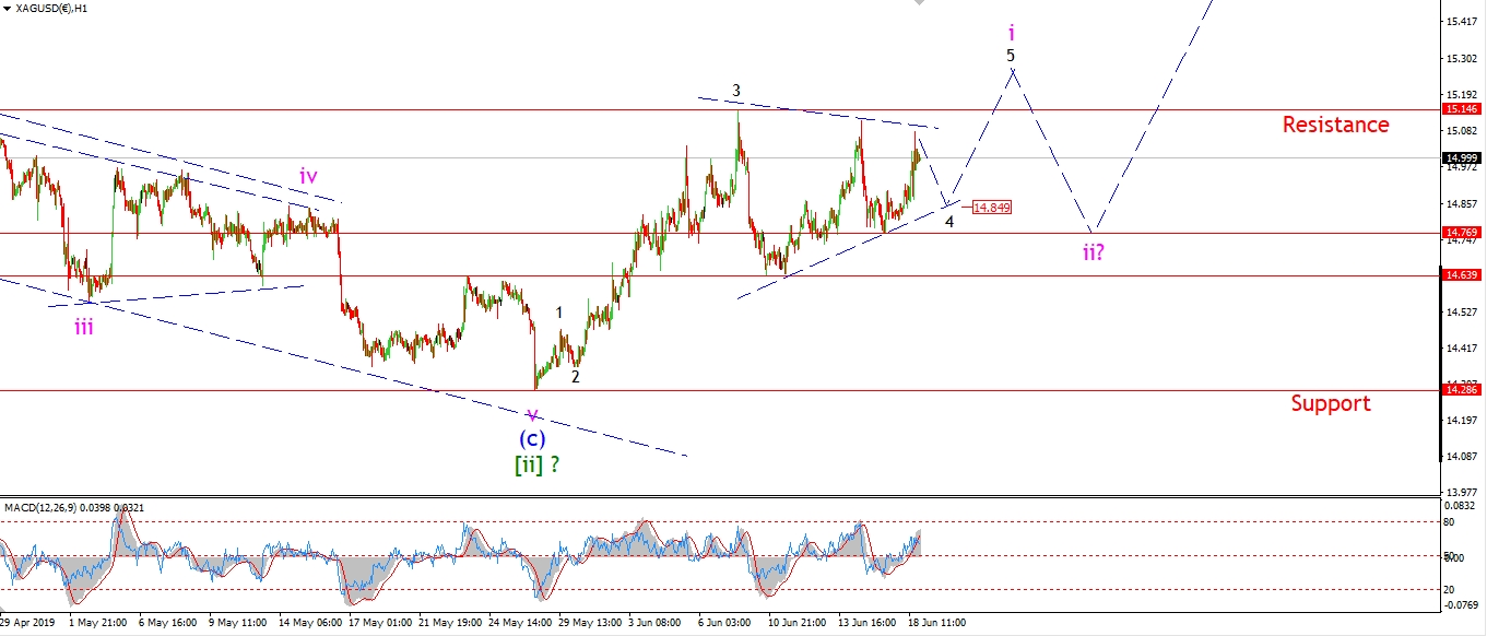 Watch for wave ‘4’ to complete with a drop into the lower trend-line at 14.85.