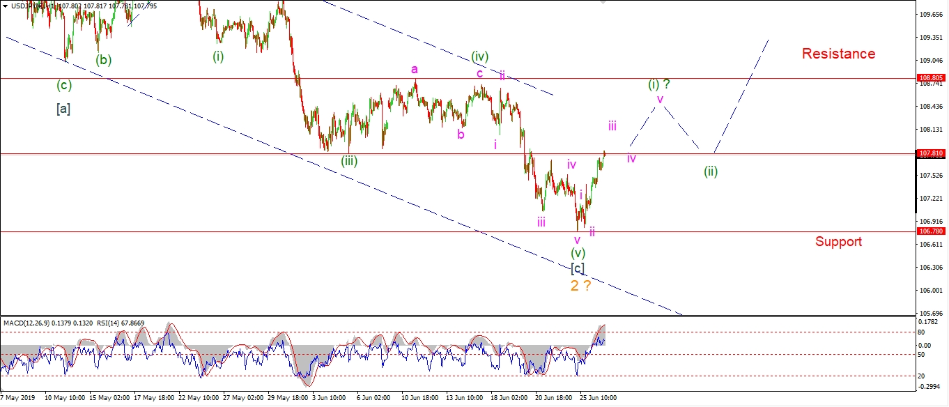 Watch for wave (i) to continue higher towards resistance at 108.80 tomorrow