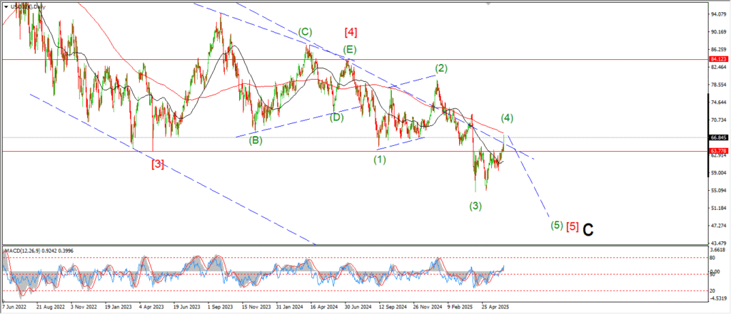 Watch for wave ‘1’ of (5) to break below 64.00 this week in five waves.