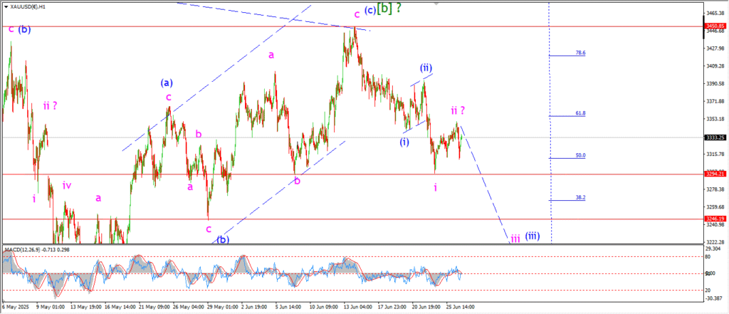 There is nothing to add to the pattern here tonight apart form the five wave pattern in place for wave ‘v’ pink.