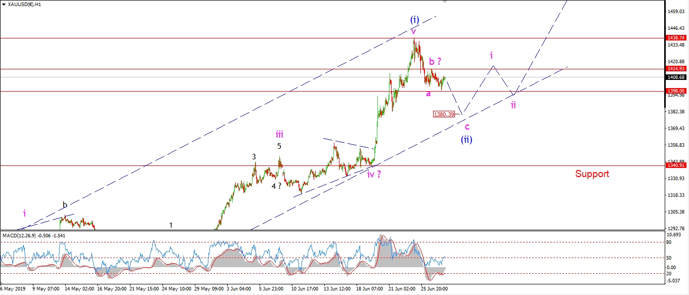 Gold is falling again off a very short lived wave ‘b’ high at 1414.