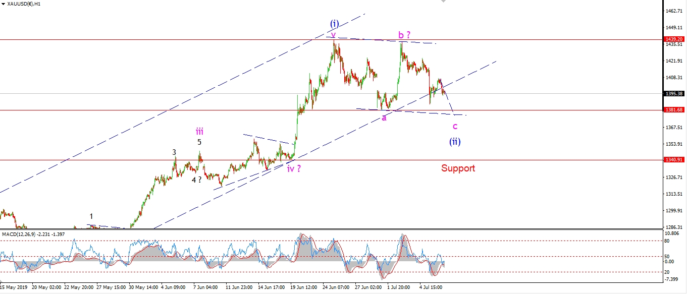 Watch for wave ‘c’ to break the wave ‘a’ low at 1381 and trace out a clear five wave decline.