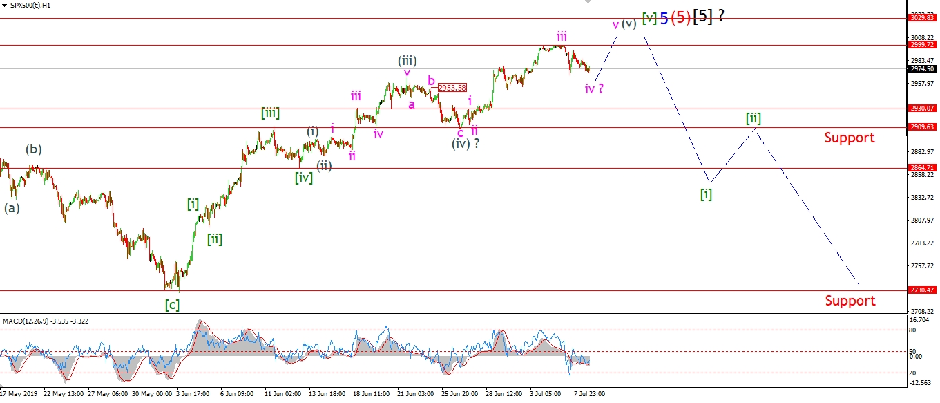 The S&P is faltering at that 3000 level now as we trace out the last few internal waves up in wave ‘5’ blue.