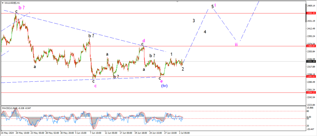 Gold continues to hold above the wave (iv) low at 2293 today.