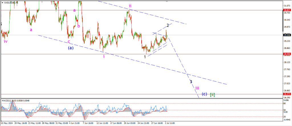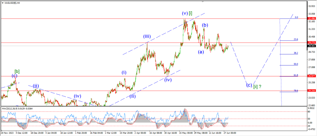 A drop below 28.55 is what I am looking for the signal wave ‘3’ of ‘iii’ of (c) has begun.