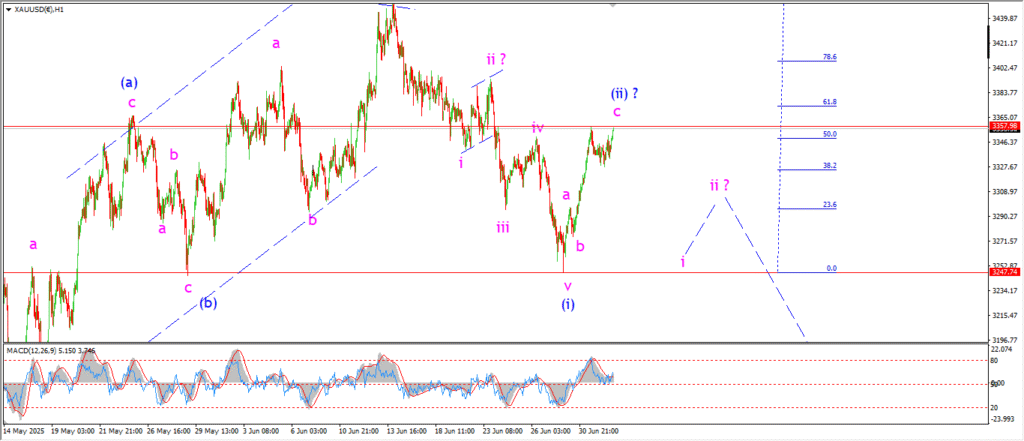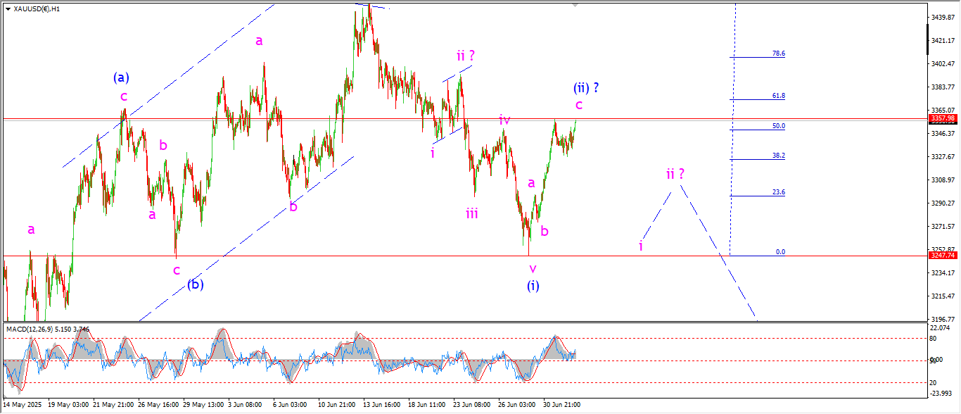 Watch for a turn into wave ‘i’ with a break below 3300 again.
