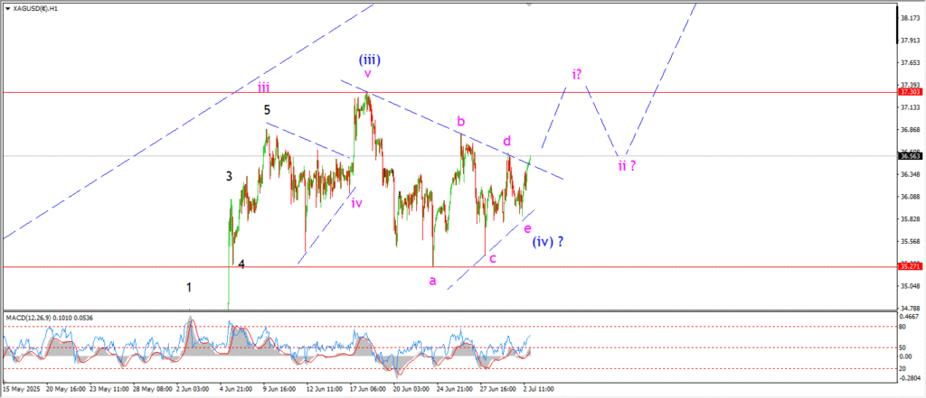 Watch for wave ‘i’ to push up to the recent highs at 37.30 again in five waves to confirm that wave (v) is underway.