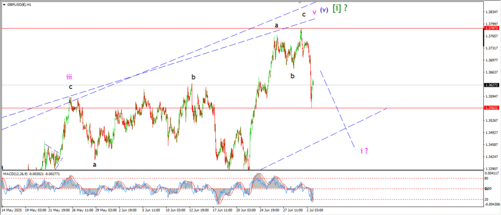 Cable turned sharply lower today and the price broke below the previous wave ‘iii’ high at 1.3595.