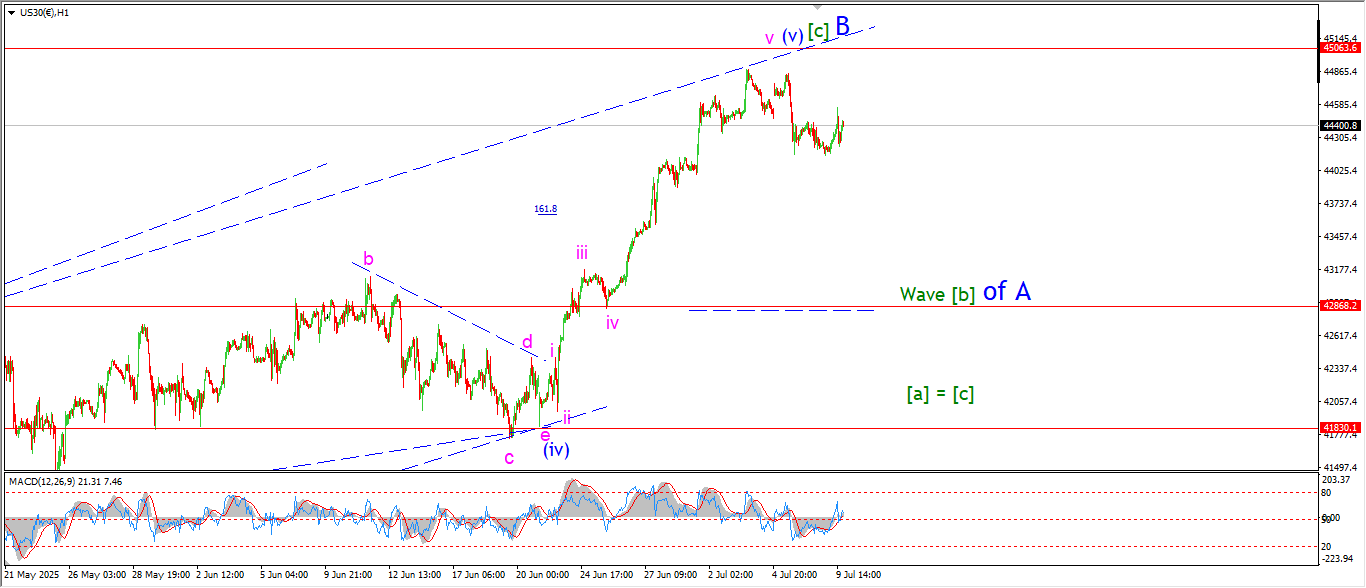 My initial target for the next move off the top lies at the wave (iv) low at 42868,