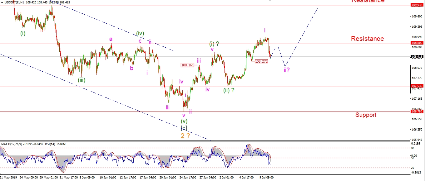 Watch for wave ‘ii’ to continue lower in a three wave form to create a bullish higher low above 107.53.