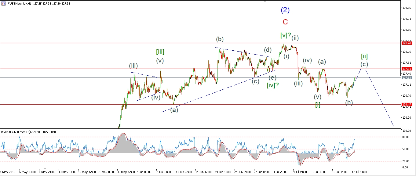 Watch for wave (c) to top out with a break of 127.60 and then begin to drop again in wave [iii].
