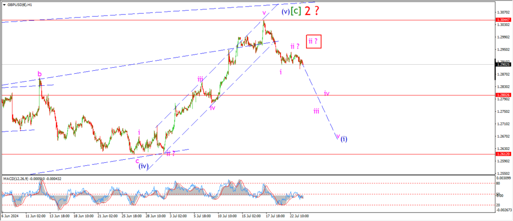 Watch for wave ‘iii’ to fall and hit the 1.2800 handle to confirm the larger move into wave (i).