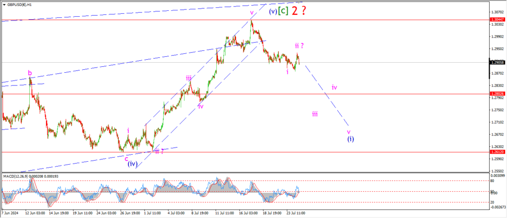 Watch for wave ‘i’ and ‘ii’ to hold and wave ‘iii’ down to continue in an impulsive pattern towards 1.2750.