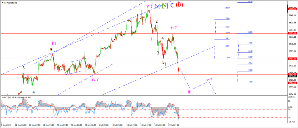Watch for wave ‘iii’ down to continue to that minimum target level at 5413.