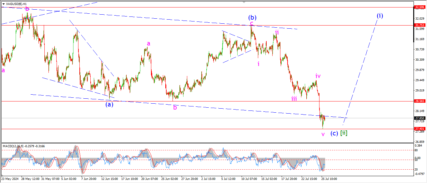 Silver has completely invalidated the previous count today by breaking back below 28.56 again.