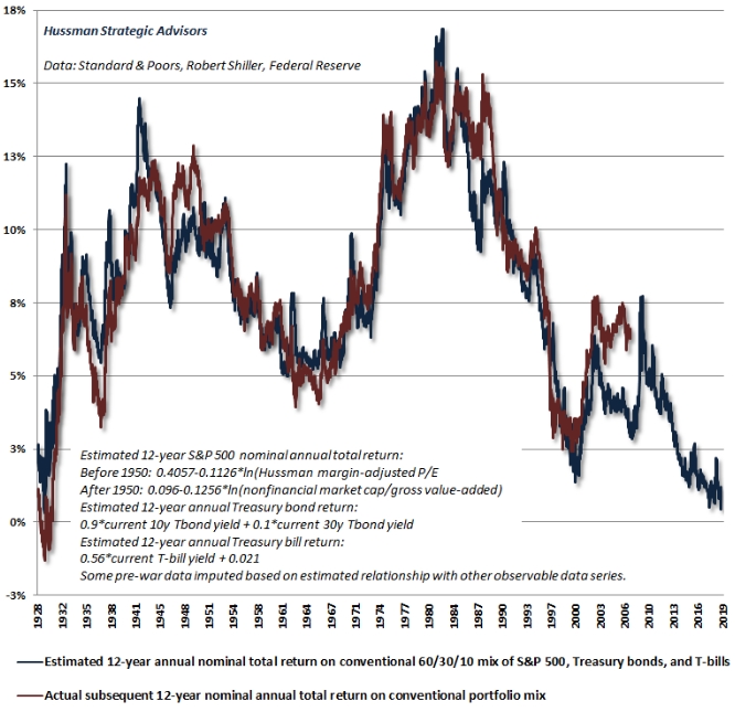 Our estimate of 12-year prospective returns for a conventional portfolio mix (60% S&P 500, 30% Treasury bonds, 10% Tbills) is now down to 0.46%.