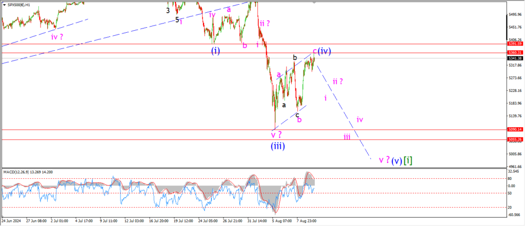 Watch for wave (iv) to hold below the wave (i) level at 5390.