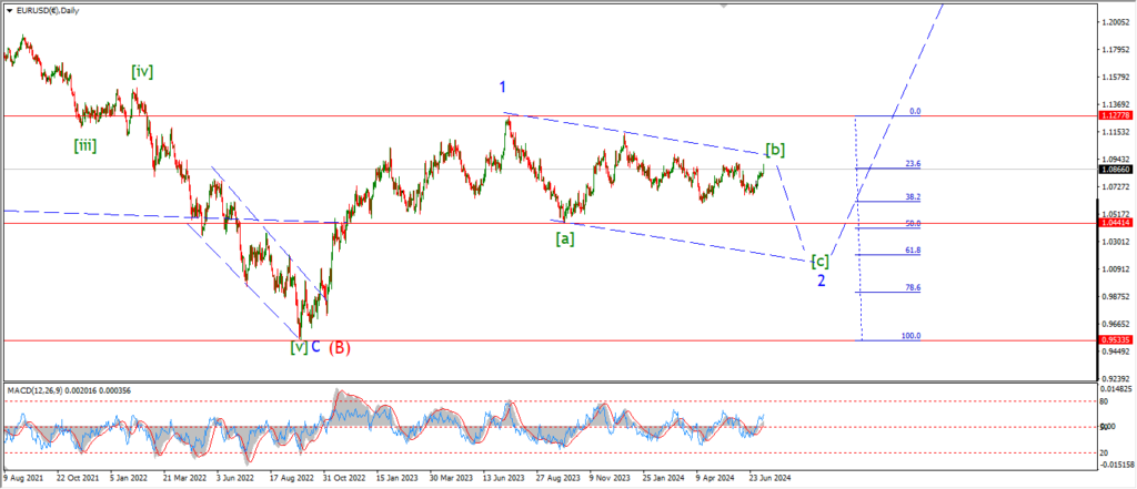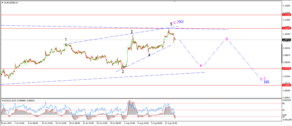 Wave ‘a’ of (d) should fall back into the recent support at 1.0777 again in three waves.