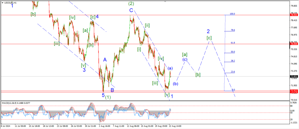 Crude bounced off the lows of wave ‘1’ today and I am looking at a reversal into wave ‘2’ now underway.
