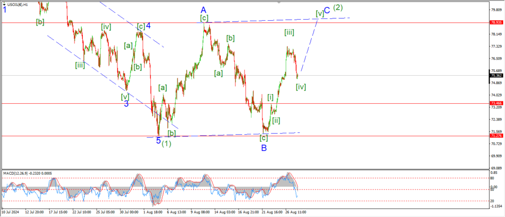 wave [v] should now turn higher to break the wave ‘A’ high at 78.95 to complete the larger correction in wave (2).