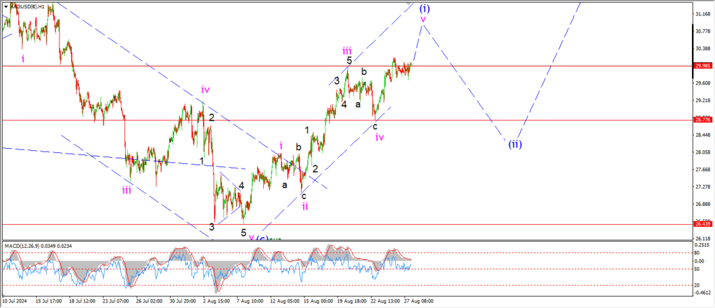 Watch for wave ‘v’ of (i) to top out near 31.00 and then wave (ii) should begin.