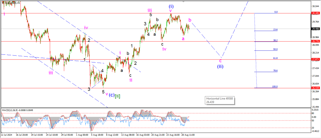 And from there we should see a drop to about 27.87 at the 62% retracement level to complete wave (ii).