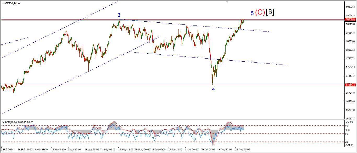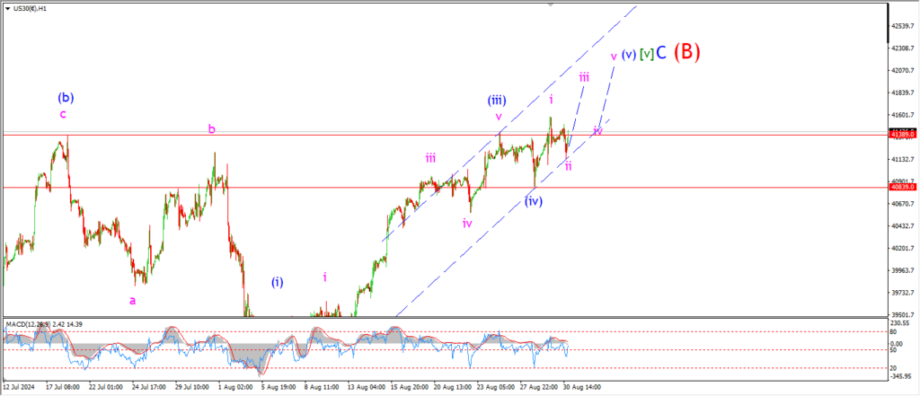 Watch for wave (iv) to hold at 40840 and a five wave ending diagonal pattern to develop higher as shown.
