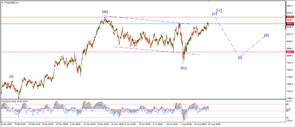 I have labelled a possible ending diagonal pattern for wave (v) blue this evening.