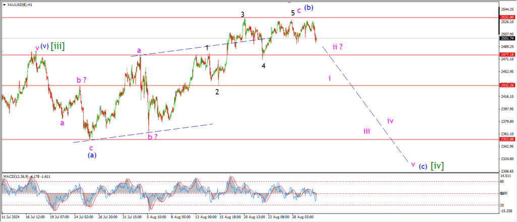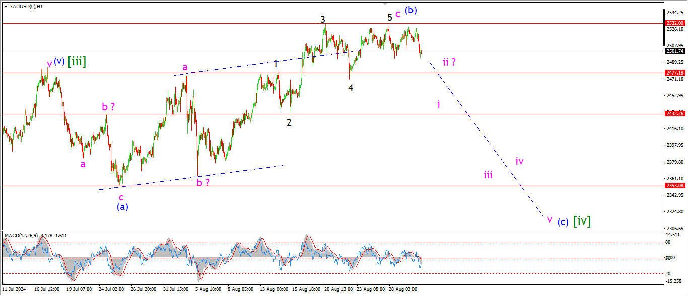 Gold dipped below 2500 today briefly but the that decline is not enough to confirm wave ‘5’ of ‘c’ has topped yet.