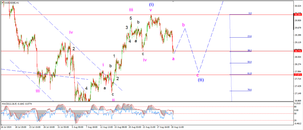 Wave ‘c’ of (ii) is still expected to fall back into the 62% retracement level at 27.87 to complete.