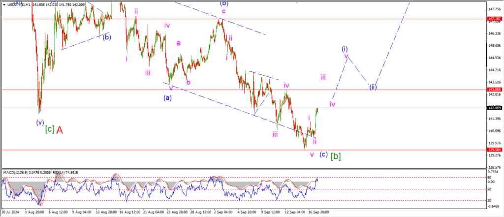 Watch for wave (i) to continue higher as shown and break the 143.00 level in wave ‘iii’ pink.