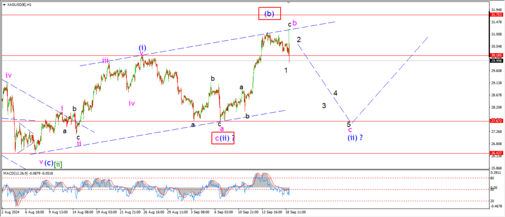 Silver jumped this evening then dived off the highs again to suggests wave ‘b’ is finally complete here.