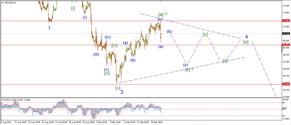 Crude oil dropped out of Fridays highs today and that suggests wave [a] of ‘4’ is now done at 71.69.