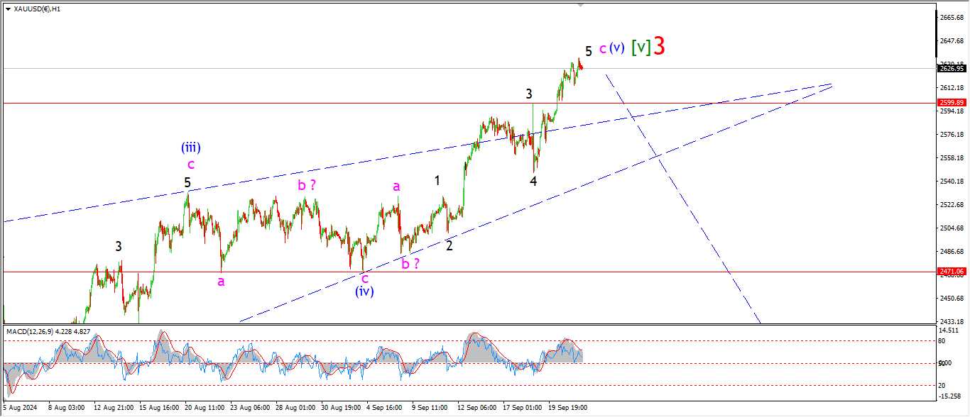 We will see tomorrow if there is a reaction off the upper trend line as wave ‘5’ completes,